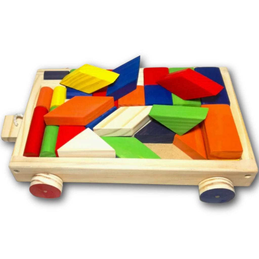 Estás viendo nuestro juego CARRO CON BLOQUES, una dinámica de juego que tiene varios beneficios. El carro al tener correa funciona como arrastre estimulando a nuestro niño o niña a empezar a caminar, además cuenta con varios bloques para construcción, ya sea para apilar, para construir con un sentido o sin ninguno. También al ser bloques de colores podemos empezar a enseñarles sus nombres.